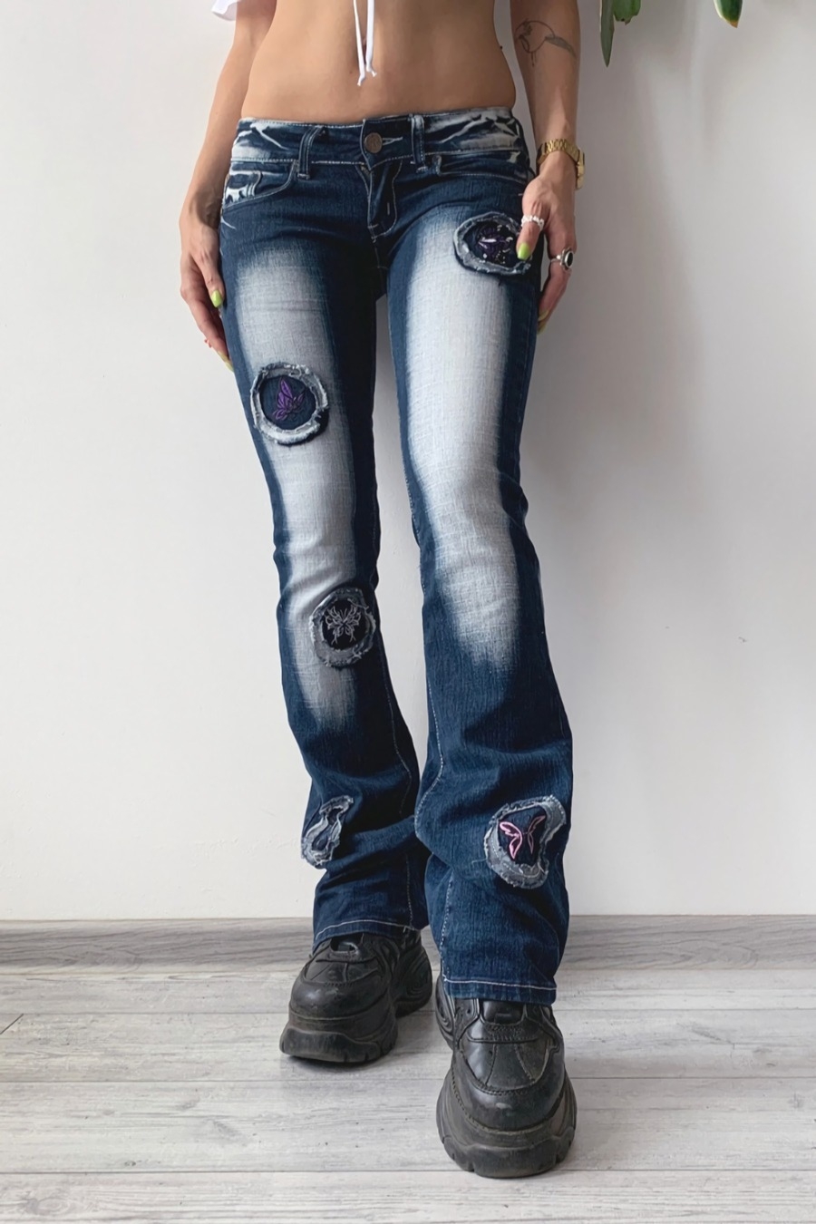 Summer New High-Waisted Button Denim Micro-Elastic Butterfly Fixed Printing Bootcut Jeans(No Pocket)